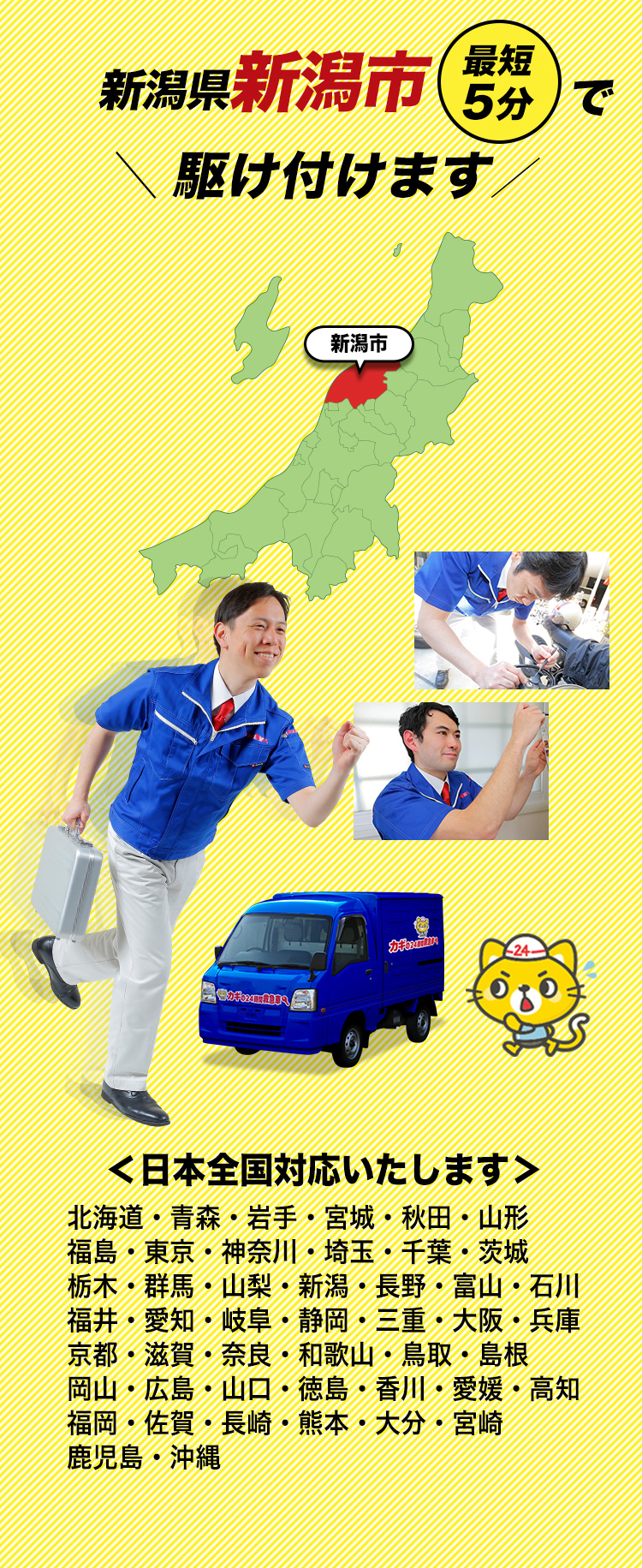 新潟の「カギの出張24時間」は、新潟市の広範囲に迅速に対応。雪国新潟の厳しい環境にも対応可能な鍵サービスを年中無休で提供し、お客様の安心を第一に考えています。信頼と安全をお届けします。